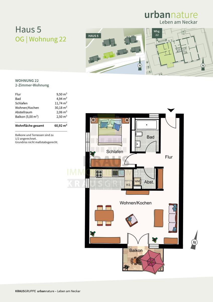Die zum Verkauf stehende 2-Zimmer-Wohnung befindet sich im 1. Obergeschoss des Mehrfamilienhauses (Haus 5) und erstreckt sich über ca. 60,92 m² Wohnfläche (Wohnung-Nr. 22). Über den Flur sind alle Räume zugänglich: das großzügige Wohn- und Esszimmer mit offener Küche und Zugang zu dem nach Süden gelegenen Balkon mit Neckarblick, das Schlafzimmer, das Tageslichtbad mit Wanne und WC, sowie der Abstellraum mit Waschmaschinenanschluss.