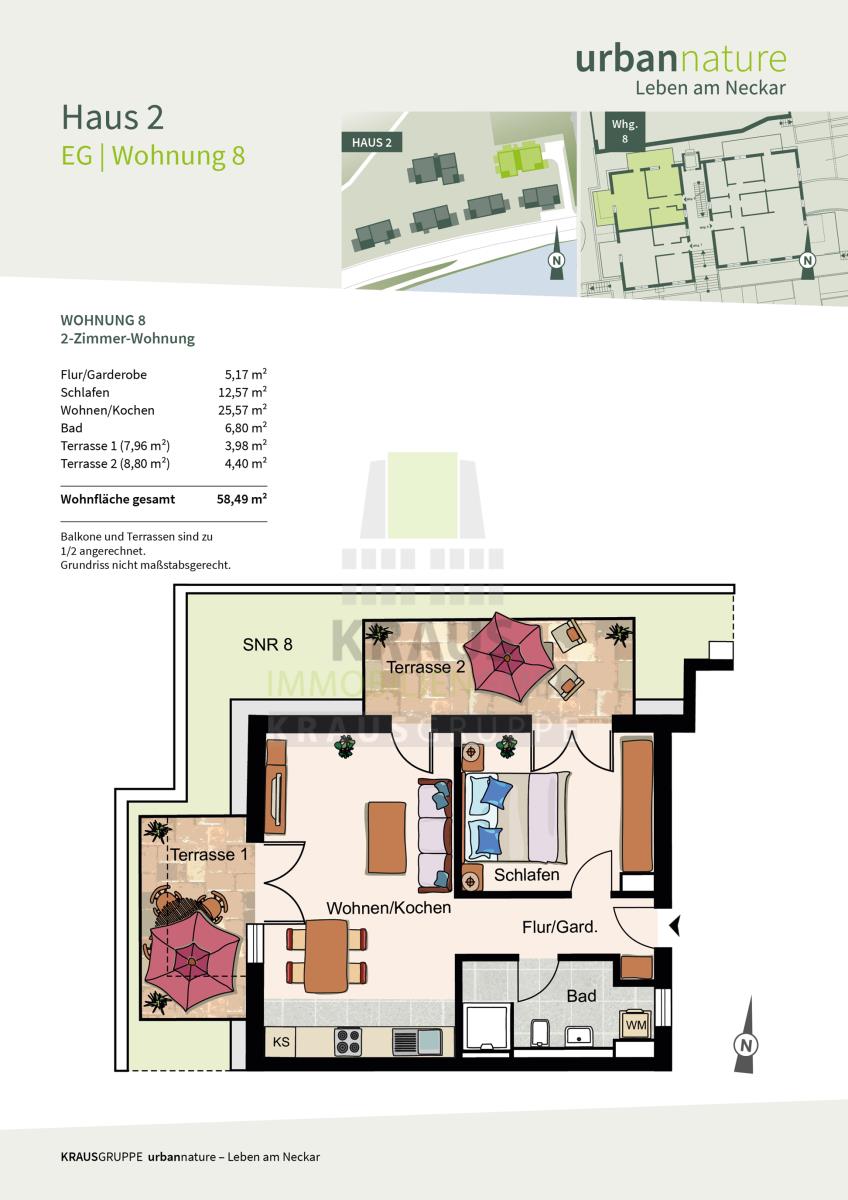 Die zum Verkauf stehende 2-Zimmer-Wohnung befindet sich im Erdgeschoss des Mehrfamilienhauses mit Aufzug (Haus 2) und erstreckt sich über ca. 58,49 m² Wohnfläche (Wohnung-Nr. 08). Über den Flur sind alle Räume zugänglich: das großzügige Wohn- und Esszimmer mit offener Küche und Zugang zu den beiden Terrassen, das Schlafzimmer, ebenfalls mit Zugang zur Terrasse sowie das Tageslichtbad mit Dusche, WC und Waschmaschinenanschluss.