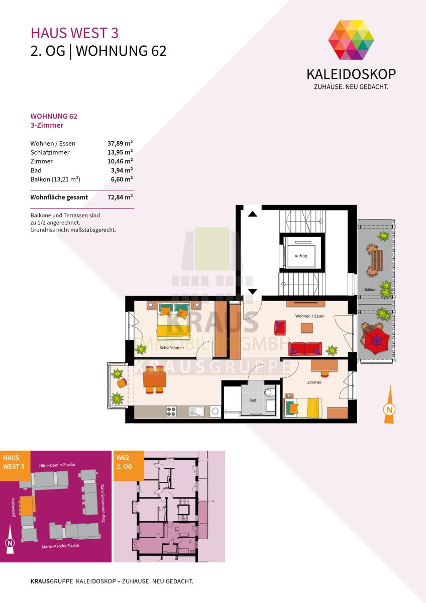 Neubauprojekt KALEIDOSKOP – ZUHAUSE. NEU GEDACHT. Ein Quartier, lebendig-bunt wie der Blick ins Kaleidoskop. Die KRAUSGRUPPE errichtet hier bis Herbst 2026 insgesamt 83 Wohneinheiten verteilt auf zwölf Gebäude. Der vielfältige Wohnungsmix bietet Raum für jeden Bedarf: von einem 2-Zimmer-Appartement über lichtdurchflutete Penthouse-Wohnungen oder ein attraktives Stadthaus – bis hin zum Atelierwohnen, das Möglichkeiten für eine gemischte Nutzung zum Wohnen und Arbeiten bietet.