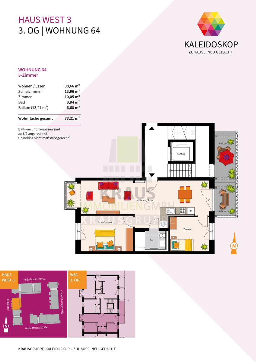 Neubauprojekt KALEIDOSKOP – ZUHAUSE. NEU GEDACHT. Ein Quartier, lebendig-bunt wie der Blick ins Kaleidoskop. Die KRAUSGRUPPE errichtet hier bis Herbst 2026 insgesamt 83 Wohneinheiten verteilt auf zwölf Gebäude. Der vielfältige Wohnungsmix bietet Raum für jeden Bedarf: von einem 2-Zimmer-Appartement über lichtdurchflutete Penthouse-Wohnungen oder ein attraktives Stadthaus – bis hin zum Atelierwohnen, das Möglichkeiten für eine gemischte Nutzung zum Wohnen und Arbeiten bietet.