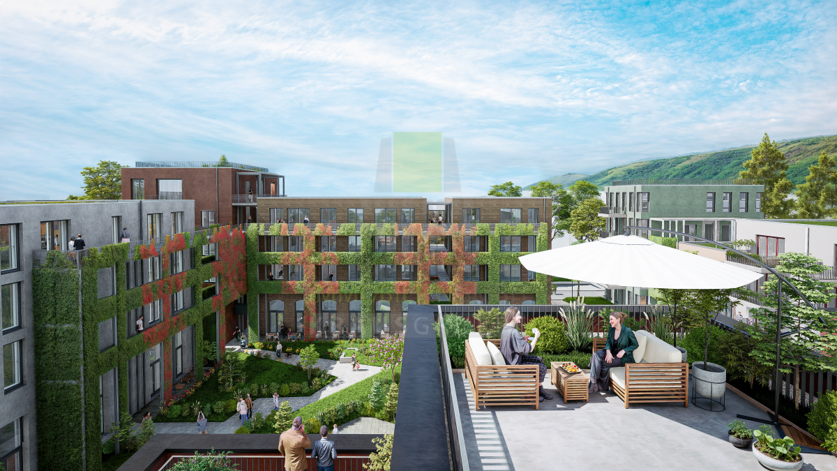 Die Fassaden der einzelnen Häuser werden architektonisch abwechslungsreich gestaltet – und als Ensemble fein aufeinander abgestimmt. Jedes Detail fügt sich harmonisch in das große Ganze ein. Die gestuften kubischen Formen und die Dachbegrünung bewirken eine lebendige, luftige und klare Optik.