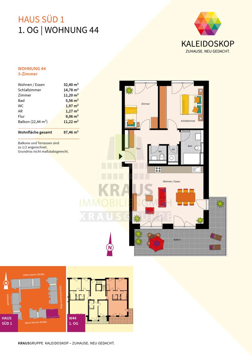 Neubauprojekt KALEIDOSKOP – ZUHAUSE. NEU GEDACHT. Ein Quartier, lebendig-bunt wie der Blick ins Kaleidoskop. Die KRAUSGRUPPE errichtet hier bis Herbst 2026 insgesamt 83 Wohneinheiten verteilt auf zwölf Gebäude. Der vielfältige Wohnungsmix bietet Raum für jeden Bedarf: von einem 2-Zimmer-Appartement über lichtdurchflutete Penthouse-Wohnungen oder ein attraktives Stadthaus – bis hin zum Atelierwohnen, das Möglichkeiten für eine gemischte Nutzung zum Wohnen und Arbeiten bietet.