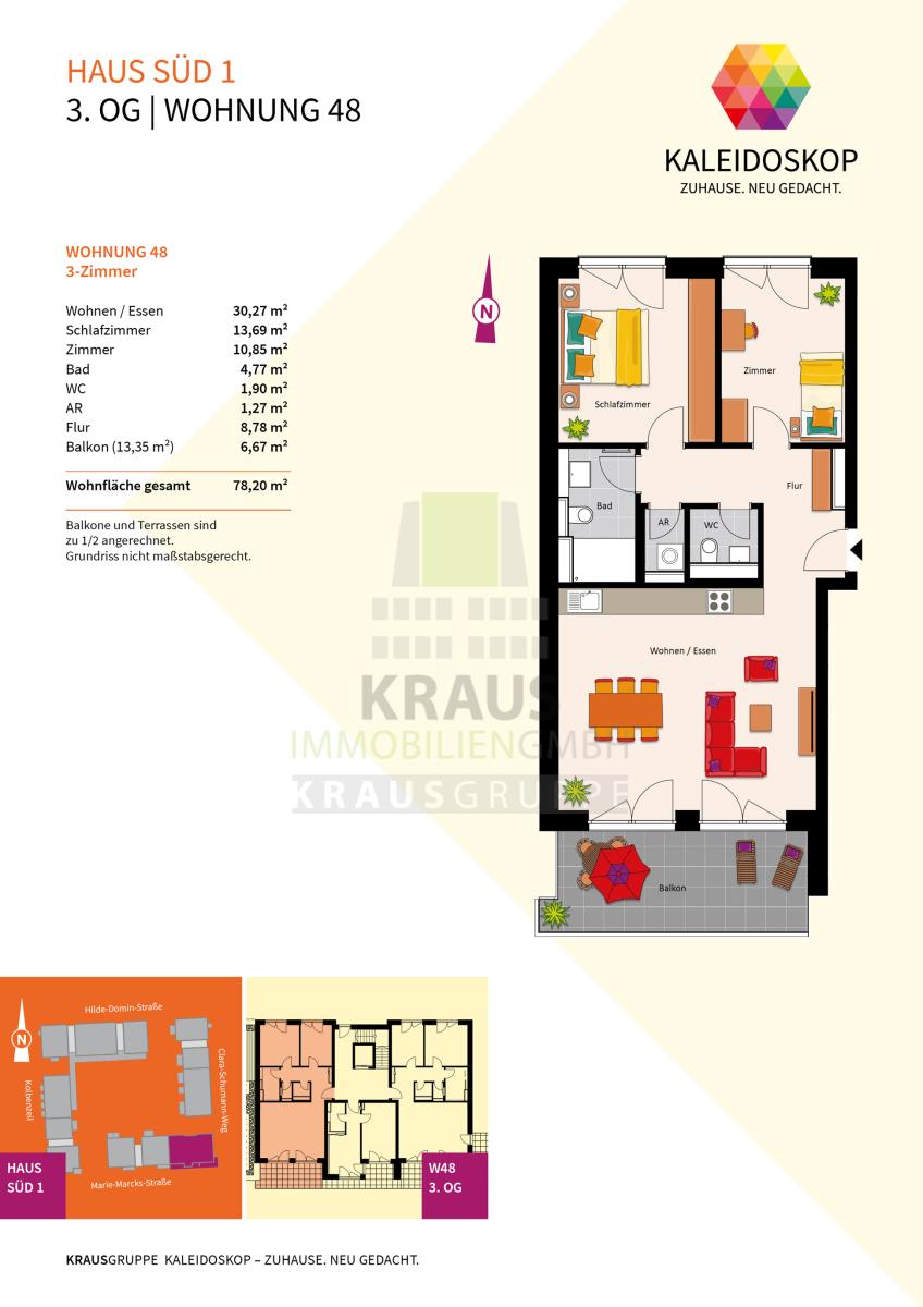 Neubauprojekt KALEIDOSKOP – ZUHAUSE. NEU GEDACHT. Ein Quartier, lebendig-bunt wie der Blick ins Kaleidoskop. Die KRAUSGRUPPE errichtet hier bis Herbst 2026 insgesamt 83 Wohneinheiten verteilt auf zwölf Gebäude. Der vielfältige Wohnungsmix bietet Raum für jeden Bedarf: von einem 2-Zimmer-Appartement über lichtdurchflutete Penthouse-Wohnungen oder ein attraktives Stadthaus – bis hin zum Atelierwohnen, das Möglichkeiten für eine gemischte Nutzung zum Wohnen und Arbeiten bietet.