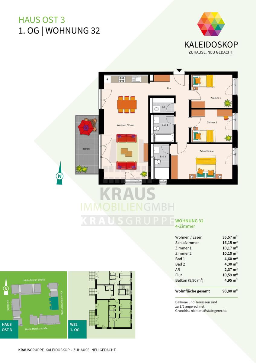 Neubauprojekt KALEIDOSKOP – ZUHAUSE. NEU GEDACHT. Ein Quartier, lebendig-bunt wie der Blick ins Kaleidoskop. Die KRAUSGRUPPE errichtet hier bis Herbst 2026 insgesamt 83 Wohneinheiten verteilt auf zwölf Gebäude. Der vielfältige Wohnungsmix bietet Raum für jeden Bedarf: von einem 2-Zimmer-Appartement über lichtdurchflutete Penthouse-Wohnungen oder ein attraktives Stadthaus – bis hin zum Atelierwohnen, das Möglichkeiten für eine gemischte Nutzung zum Wohnen und Arbeiten bietet.