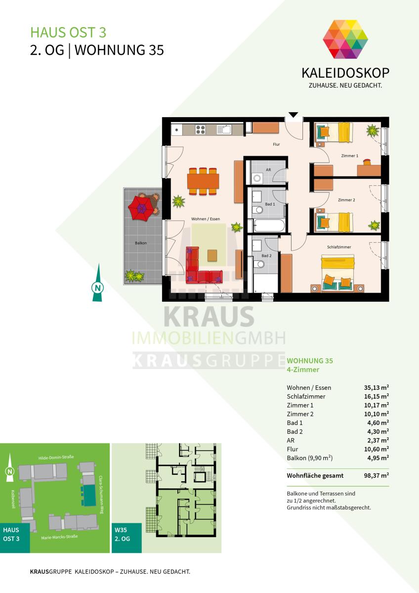 Neubauprojekt KALEIDOSKOP – ZUHAUSE. NEU GEDACHT. Ein Quartier, lebendig-bunt wie der Blick ins Kaleidoskop. Die KRAUSGRUPPE errichtet hier bis Herbst 2026 insgesamt 83 Wohneinheiten verteilt auf zwölf Gebäude. Der vielfältige Wohnungsmix bietet Raum für jeden Bedarf: von einem 2-Zimmer-Appartement über lichtdurchflutete Penthouse-Wohnungen oder ein attraktives Stadthaus – bis hin zum Atelierwohnen, das Möglichkeiten für eine gemischte Nutzung zum Wohnen und Arbeiten bietet.