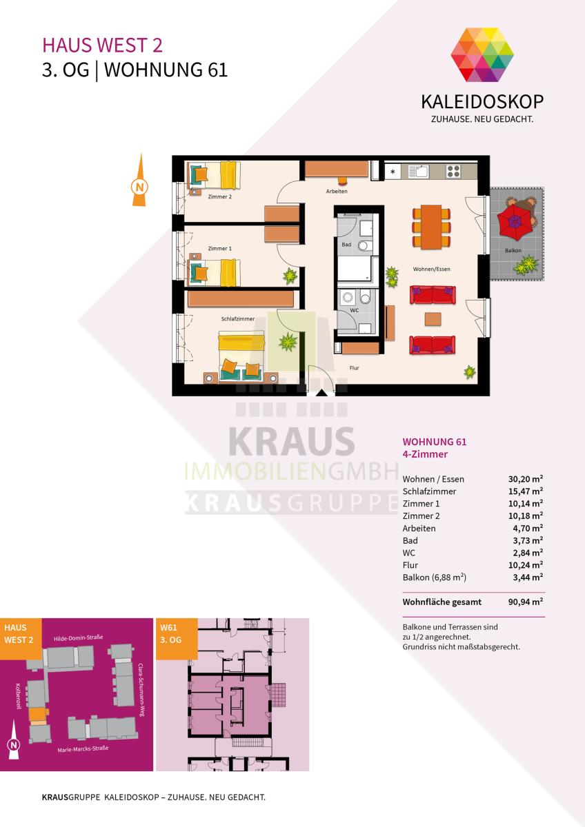 Neubauprojekt KALEIDOSKOP – ZUHAUSE. NEU GEDACHT. Ein Quartier, lebendig-bunt wie der Blick ins Kaleidoskop. Die KRAUSGRUPPE errichtet hier bis Herbst 2026 insgesamt 83 Wohneinheiten verteilt auf zwölf Gebäude. Der vielfältige Wohnungsmix bietet Raum für jeden Bedarf: von einem 2-Zimmer-Appartement über lichtdurchflutete Penthouse-Wohnungen oder ein attraktives Stadthaus – bis hin zum Atelierwohnen, das Möglichkeiten für eine gemischte Nutzung zum Wohnen und Arbeiten bietet.