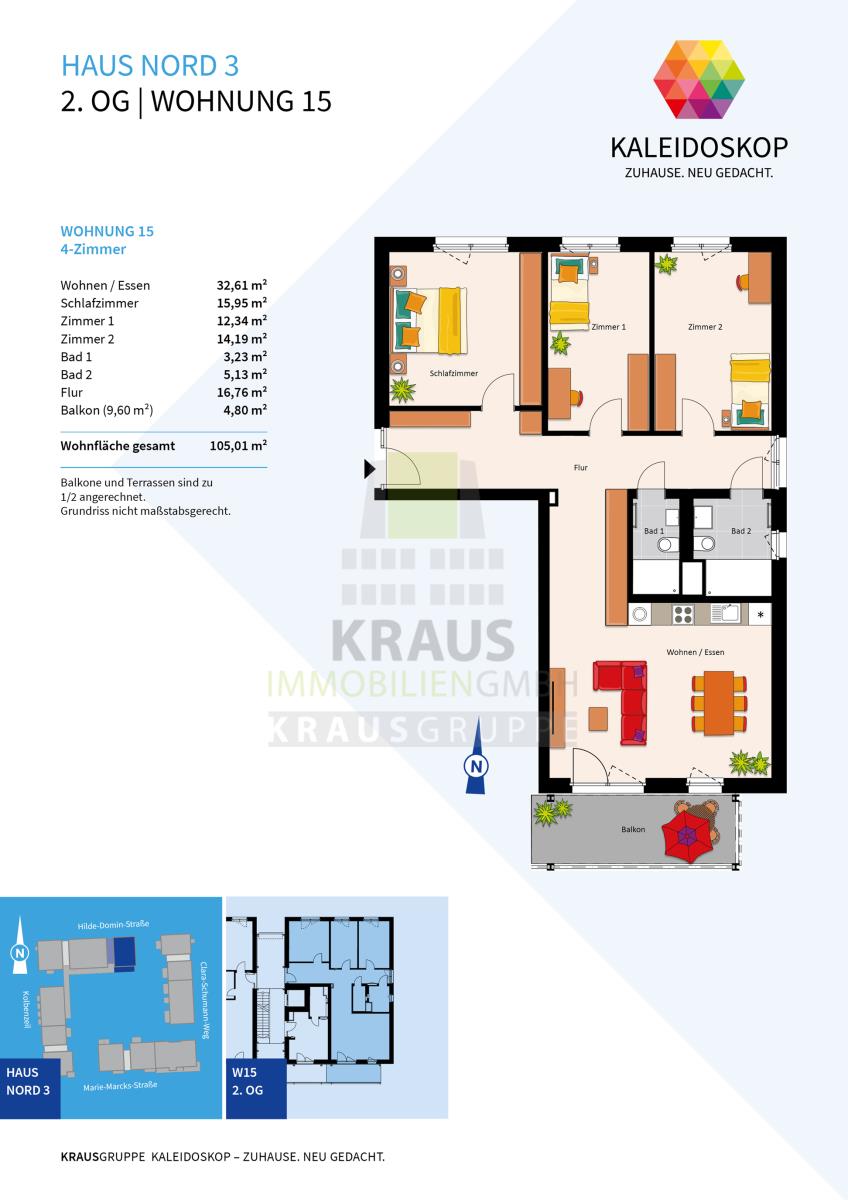 Neubauprojekt KALEIDOSKOP – ZUHAUSE. NEU GEDACHT. Ein Quartier, lebendig-bunt wie der Blick ins Kaleidoskop. Die KRAUSGRUPPE errichtet hier bis Herbst 2026 insgesamt 83 Wohneinheiten verteilt auf zwölf Gebäude. Der vielfältige Wohnungsmix bietet Raum für jeden Bedarf: von einem 2-Zimmer-Appartement über lichtdurchflutete Penthouse-Wohnungen oder ein attraktives Stadthaus – bis hin zum Atelierwohnen, das Möglichkeiten für eine gemischte Nutzung zum Wohnen und Arbeiten bietet.