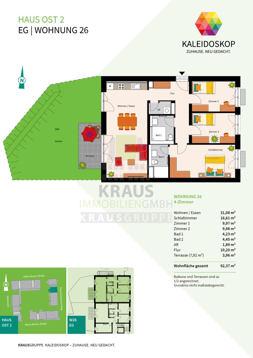 Neubauprojekt KALEIDOSKOP – ZUHAUSE. NEU GEDACHT. Ein Quartier, lebendig-bunt wie der Blick ins Kaleidoskop. Die KRAUSGRUPPE errichtet hier bis Herbst 2026 insgesamt 83 Wohneinheiten verteilt auf zwölf Gebäude. Der vielfältige Wohnungsmix bietet Raum für jeden Bedarf: von einem 2-Zimmer-Appartement über lichtdurchflutete Penthouse-Wohnungen oder ein attraktives Stadthaus – bis hin zum Atelierwohnen, das Möglichkeiten für eine gemischte Nutzung zum Wohnen und Arbeiten bietet.
