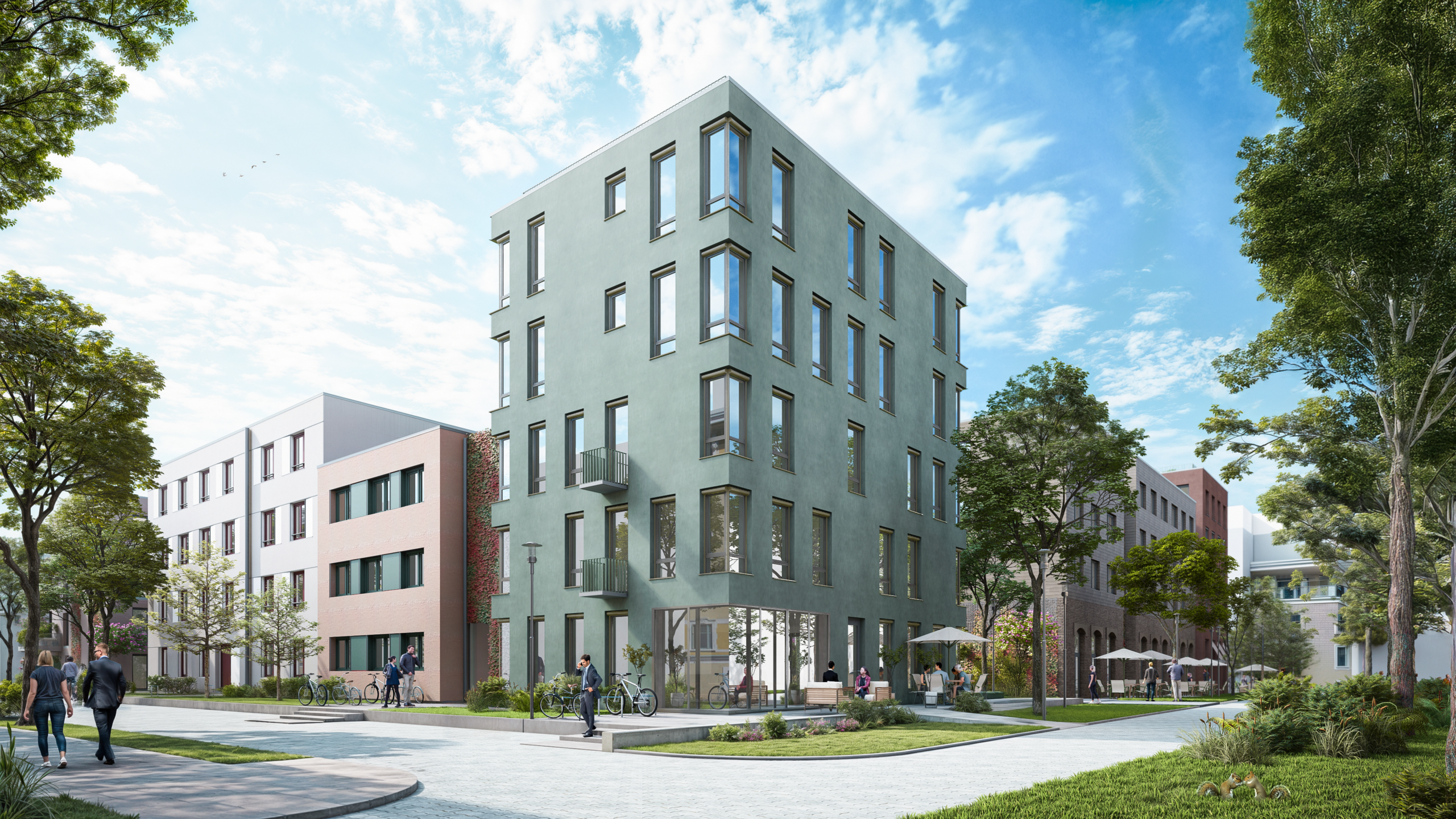 Die Fassaden der einzelnen Häuser werden architektonisch abwechslungsreich gestaltet – und als Ensemble fein aufeinander abgestimmt. Jedes Detail fügt sich harmonisch in das große Ganze ein. Die gestuften kubischen Formen und die Dachbegrünung bewirken eine lebendige, luftige und klare Optik.