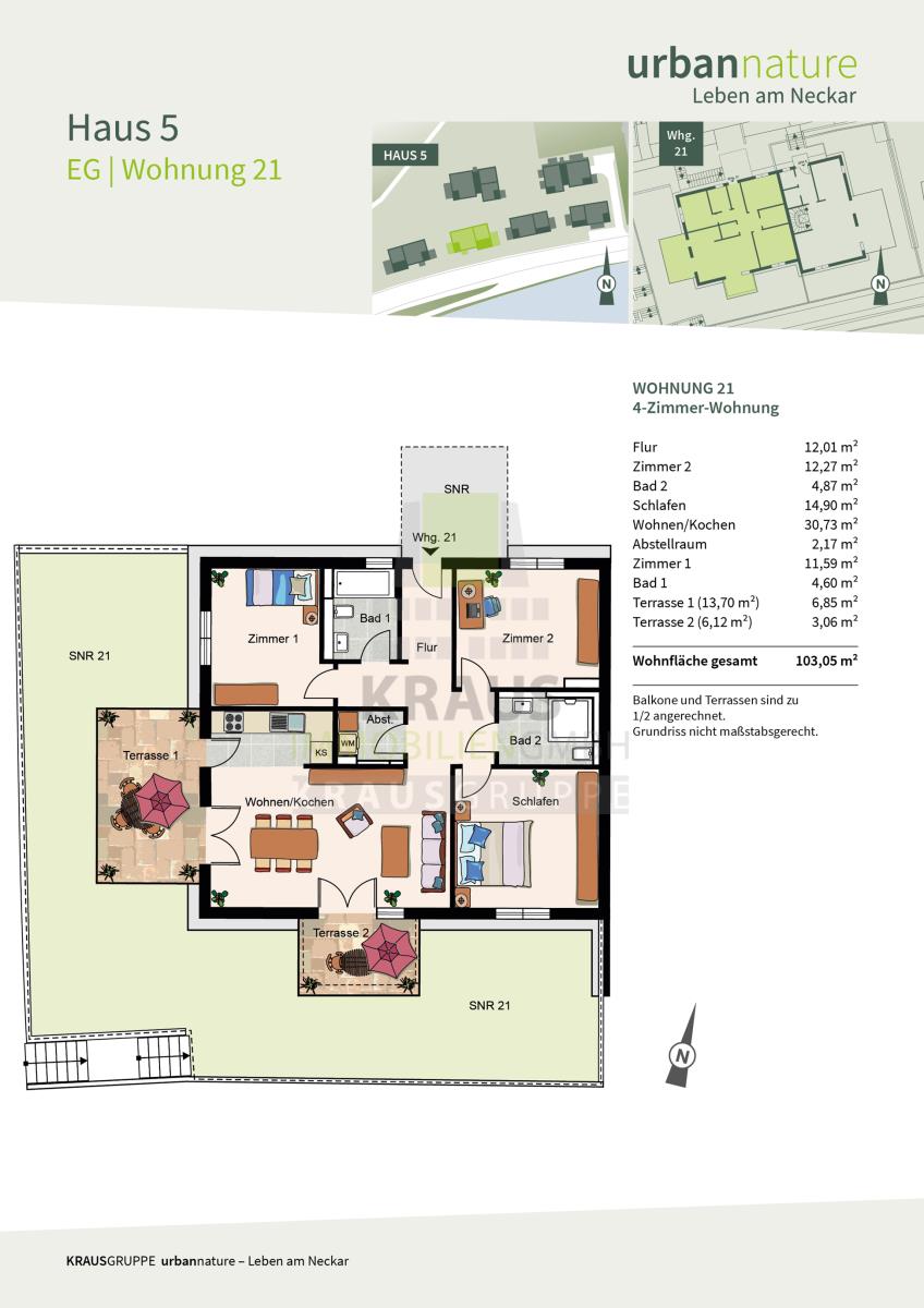 Die zum Verkauf stehende 4-Zimmer-Wohnung befindet sich im Erdgeschoss des Mehrfamilienhauses (Haus 4) und erstreckt sich über ca. 103,05 m² Wohnfläche (Wohnung-Nr. 21). Über den Flur gelangen Sie zum großzügigen Wohn- und Esszimmer mit offener Küche und Zugängen zu zwei nach Westen und Süden gelegenen Terrassen mit wunderbarem Blick zum Neckar und einem großen Gartenanteil, der zur Erholung im Grünen einlädt. Die Wohnung verfügt über ein Schlafzimmer und zwei weitere Zimmer, die als Kinder- oder Arbeitszimmer genutzt werden können. Der Grundriss wird vervollständigt durch ein Tageslichtbad mit Wanne und WC, ein zweites Bad mit barrierefreier Dusche und WC sowie einen Abstellraum mit Waschmaschinenanschluss.