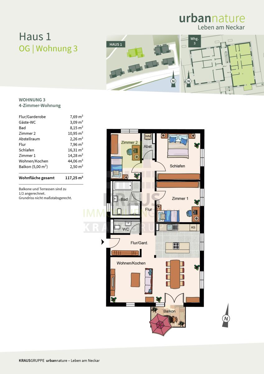Die zum Verkauf stehende 4-Zimmer-Wohnung befindet sich im Obergeschoss des Mehrfamilienhauses mit Aufzug (Haus 1) und erstreckt sich über ca. 117,25 m² Wohnfläche (Wohnung-Nr. 03). Über den Flur gelangen Sie zum großzügigen Wohn- und Esszimmer mit offener Küche und Zugang zu dem Balkon. Die Wohnung verfügt über ein Schlafzimmer und zwei weitere Zimmer, die als Kinder- oder Arbeitszimmer genutzt werden können. Der Grundriss wird vervollständigt durch ein Tageslichtbad mit Wanne, Dusche und WC, ein Gäste-WC sowie einen Abstellraum mit Waschmaschinenanschluss.