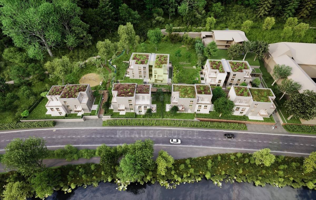 Auf dem rund 9.420 Quadratmeter großen Areal entstehen bis Herbst 2026 rund 3.300 Quadratmeter Wohnfläche – verteilt auf 26 Wohnungen sowie 4 Doppelhaushälften in insgesamt sechs in Holzbauweise ausgeführten Gebäuden in KfW55-Energieeffizienzstandard sowie eine gemeinschaftliche Sockelgarage.