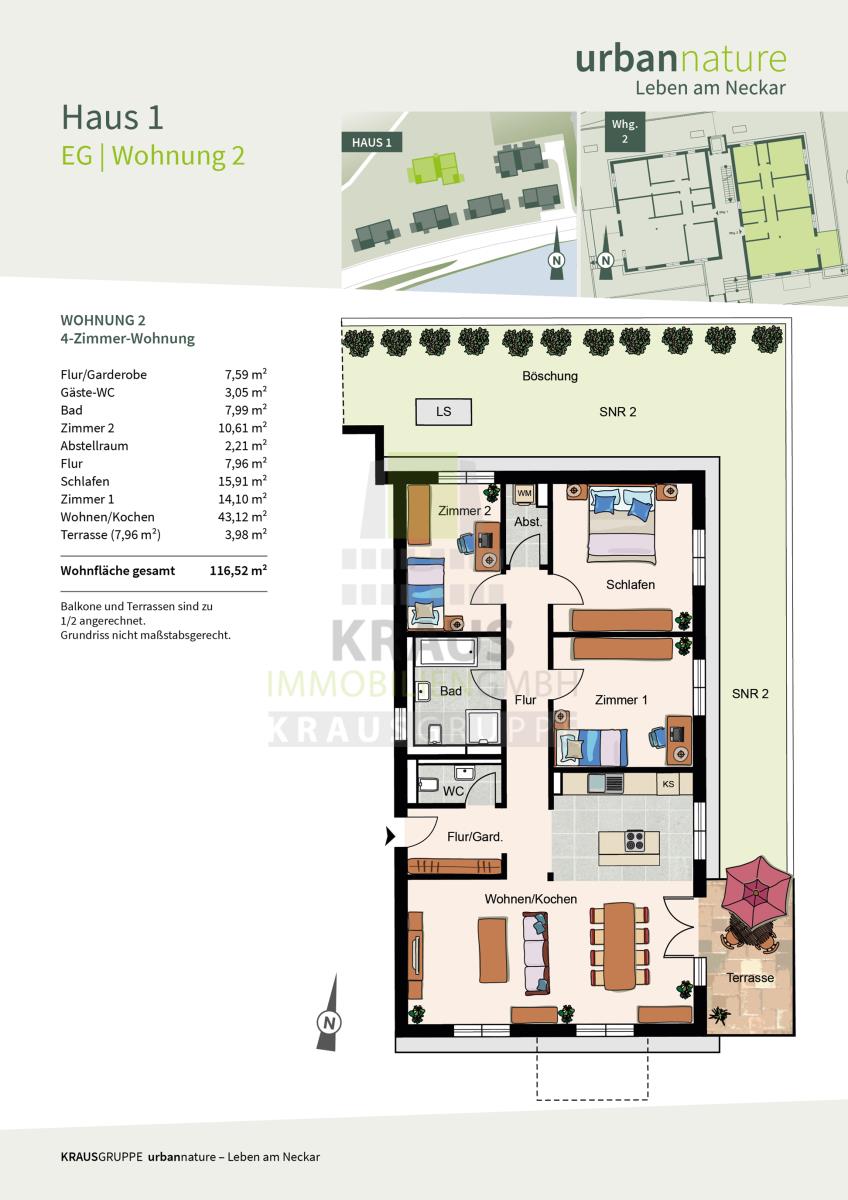 Die zum Verkauf stehende 4-Zimmer-Wohnung befindet sich im Erdgeschoss des Mehrfamilienhauses mit Aufzug (Haus 1) und erstreckt sich über ca. 116,52 m² Wohnfläche (Wohnung-Nr. 02). Über den Flur gelangen Sie zum großzügigen Wohn- und Esszimmer mit offener Küche und Zugang zu der nach Osten gelegenen Terrasse mit einem Gartenanteil, der zur Erholung im Grünen einlädt. Die Wohnung verfügt über ein Schlafzimmer und zwei weitere Zimmer, die als Kinder- oder Arbeitszimmer genutzt werden können. Der Grundriss wird vervollständigt durch ein Tageslichtbad mit Wanne, Dusche und WC, ein Gäste-WC sowie einen Abstellraum mit Waschmaschinenanschluss.