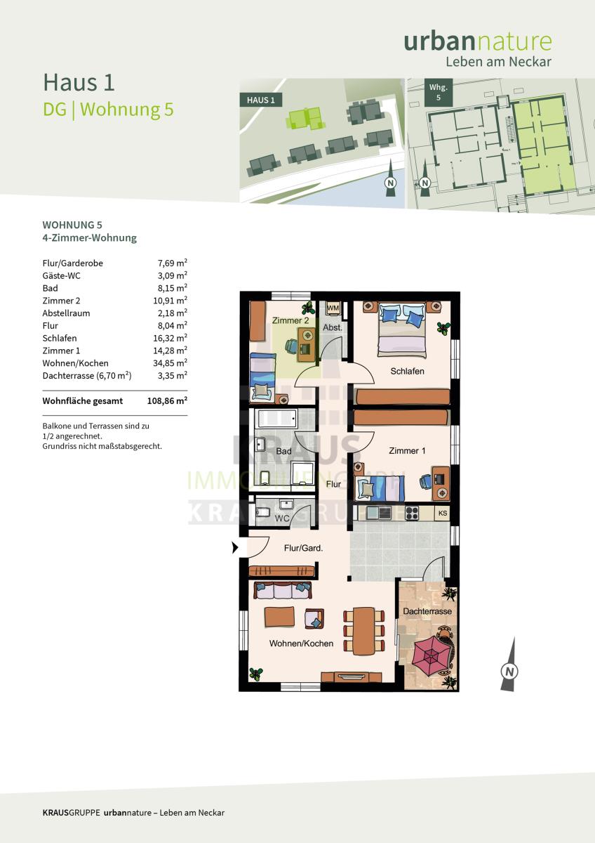 Die zum Verkauf stehende 4-Zimmer-Wohnung befindet sich im Dachgeschoss des Mehrfamilienhauses mit Aufzug (Haus 1) und erstreckt sich über ca. 108,86 m² Wohnfläche (Wohnung-Nr. 05). Über den Flur gelangen Sie zum großzügigen Wohn- und Esszimmer mit offener Küche und Zugang zu der nach Süd-Westen gelegenen Dachterrasse. Die Wohnung verfügt über ein Schlafzimmer und zwei weitere Zimmer, die als Kinder- oder Arbeitszimmer genutzt werden können. Der Grundriss wird vervollständigt durch ein Tageslichtbad mit Wanne, Dusche und WC, ein Gäste-WC sowie einen Abstellraum mit Waschmaschinenanschluss.