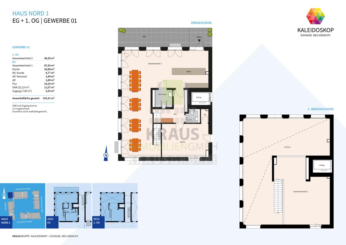 Die zur Vermietung stehende Gewerbeeinheit erstreckt sich über zwei Ebenen mit einer Gesamtfläche von ca. 193,41 m². Davon entfallen 132,32 m² auf das Erdgeschoss sowie 46,50 m² auf das 1. Obergeschoss. Eine Sondernutzungsfläche von 22,13 m² (Außenbereich zur Bestuhlung) und 7,05 m² (Zugang) sind zur Hälfte in die Gesamtfläche eingerechnet.