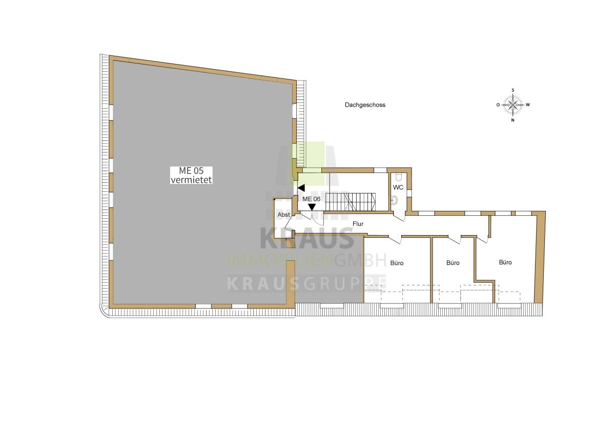 Die zu vermietende Bürofläche liegt in der 3. Etage. Die Dachschräge sorgt für ein individuelles Flair und lässt eine besondere Arbeitsatmosphäre entstehen. Die Räume sind klimatisiert und verfügen über ca. 76,83 m² Mietfläche. Vorrichtungen für eine Teeküche sind in einem der Räume vorhanden. Der Grundriss wird vervollständigt durch ein WC und einen kleinen Abstellraum.