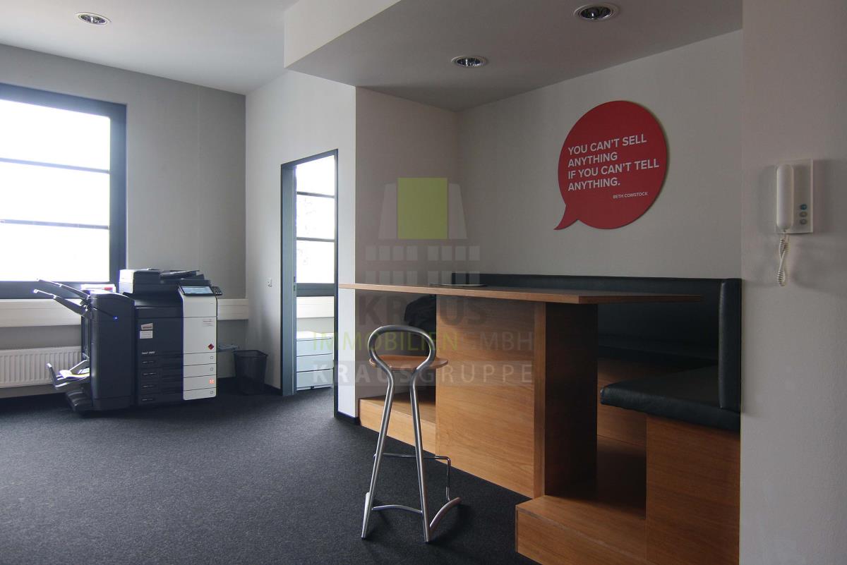 Das Büro ist aktuell aufgeteilt in 4 Büroräume, 1 Besprechungszimmer, einen Empfangsbereich mit offener Einbauküche und Theke, sowie einem Aufenthaltsbereich für Mitarbeiter und Kunden. Der Grundriss wird vervollständigt durch einen Serverraum, sowie ein WC und ein Duschbad mit WC.