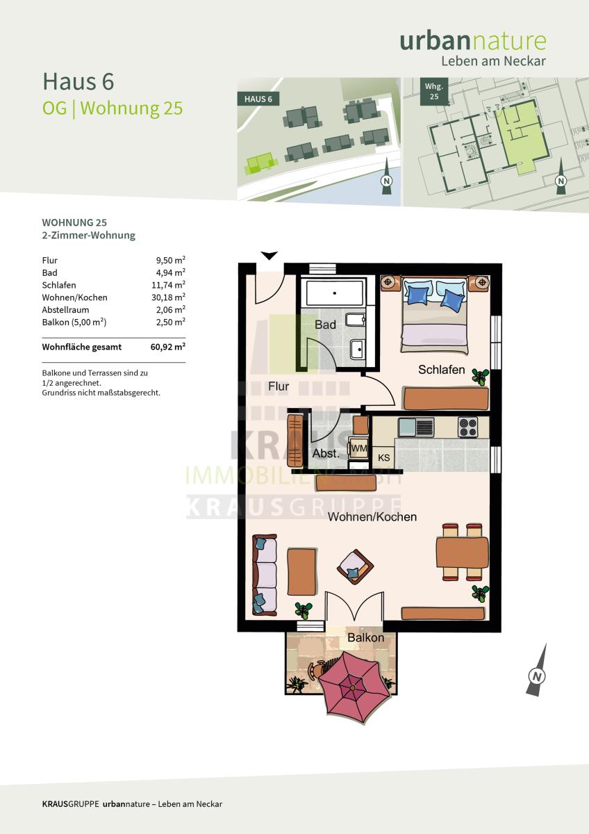 Die zum Verkauf stehende 2-Zimmer-Wohnung befindet sich im 1. Obergeschoss von Haus 6 und erstreckt sich über ca. 60,92 m² Wohnfläche (Wohnung-Nr. 25). Über den Flur sind alle Räume erreichbar: das großzügige Wohn- und Esszimmer mit offener Küche und Zugang zu dem nach Süden gelegenen Balkon mit Neckarblick, das Schlafzimmer, das Tageslichtbad mit Wanne und WC sowie ein Abstellraum mit Waschmaschinenanschluss.