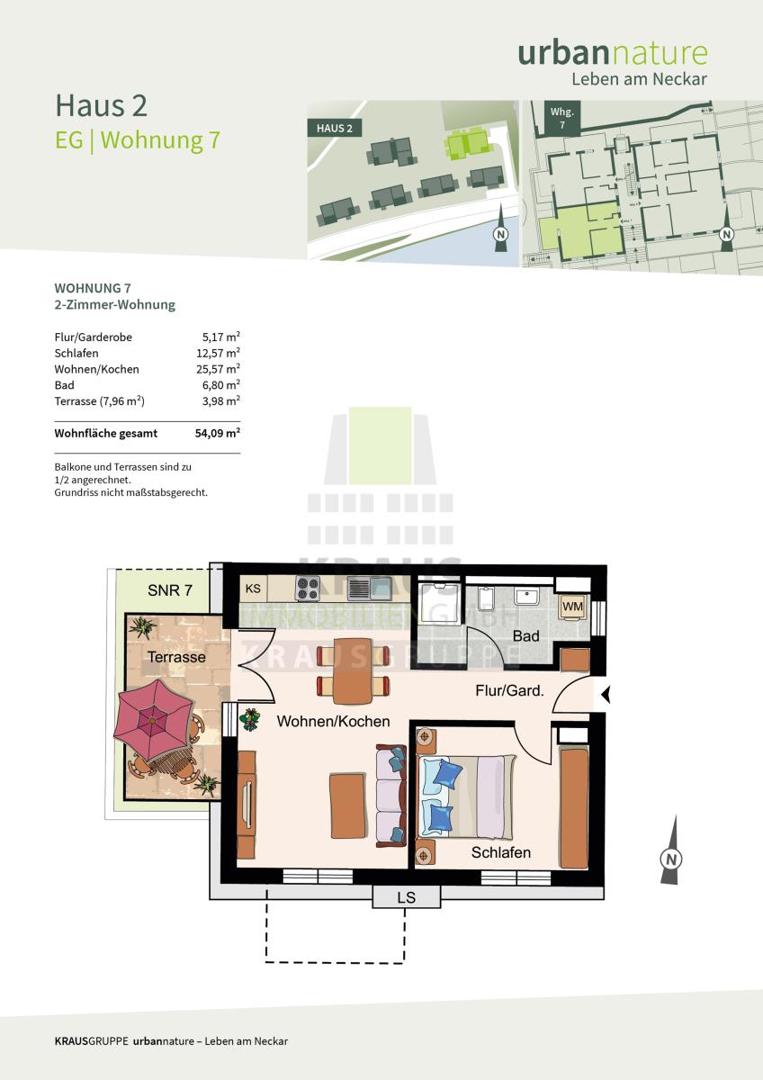 Die zum Verkauf stehende 2-Zimmer-Wohnung befindet sich im Erdgeschoss des Mehrfamilienhauses mit Aufzug (Haus 2) und erstreckt sich über ca. 54,09 m² Wohnfläche (Wohnung-Nr. 07). Über den Flur sind alle Räume zugänglich: das großzügige Wohn- und Esszimmer mit offener Küche und Zugang zu der nach Westen gelegenen Terrasse, das Schlafzimmer sowie das Tageslichtbad mit Dusche, WC und Waschmaschinenanschluss.