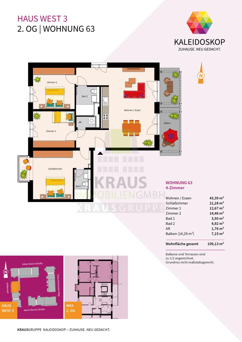 Neubauprojekt KALEIDOSKOP – ZUHAUSE. NEU GEDACHT. Ein Quartier, lebendig-bunt wie der Blick ins Kaleidoskop. Die KRAUSGRUPPE errichtet hier bis Herbst 2026 insgesamt 83 Wohneinheiten verteilt auf zwölf Gebäude. Der vielfältige Wohnungsmix bietet Raum für jeden Bedarf: von einem 2-Zimmer-Appartement über lichtdurchflutete Penthouse-Wohnungen oder ein attraktives Stadthaus – bis hin zum Atelierwohnen, das Möglichkeiten für eine gemischte Nutzung zum Wohnen und Arbeiten bietet.