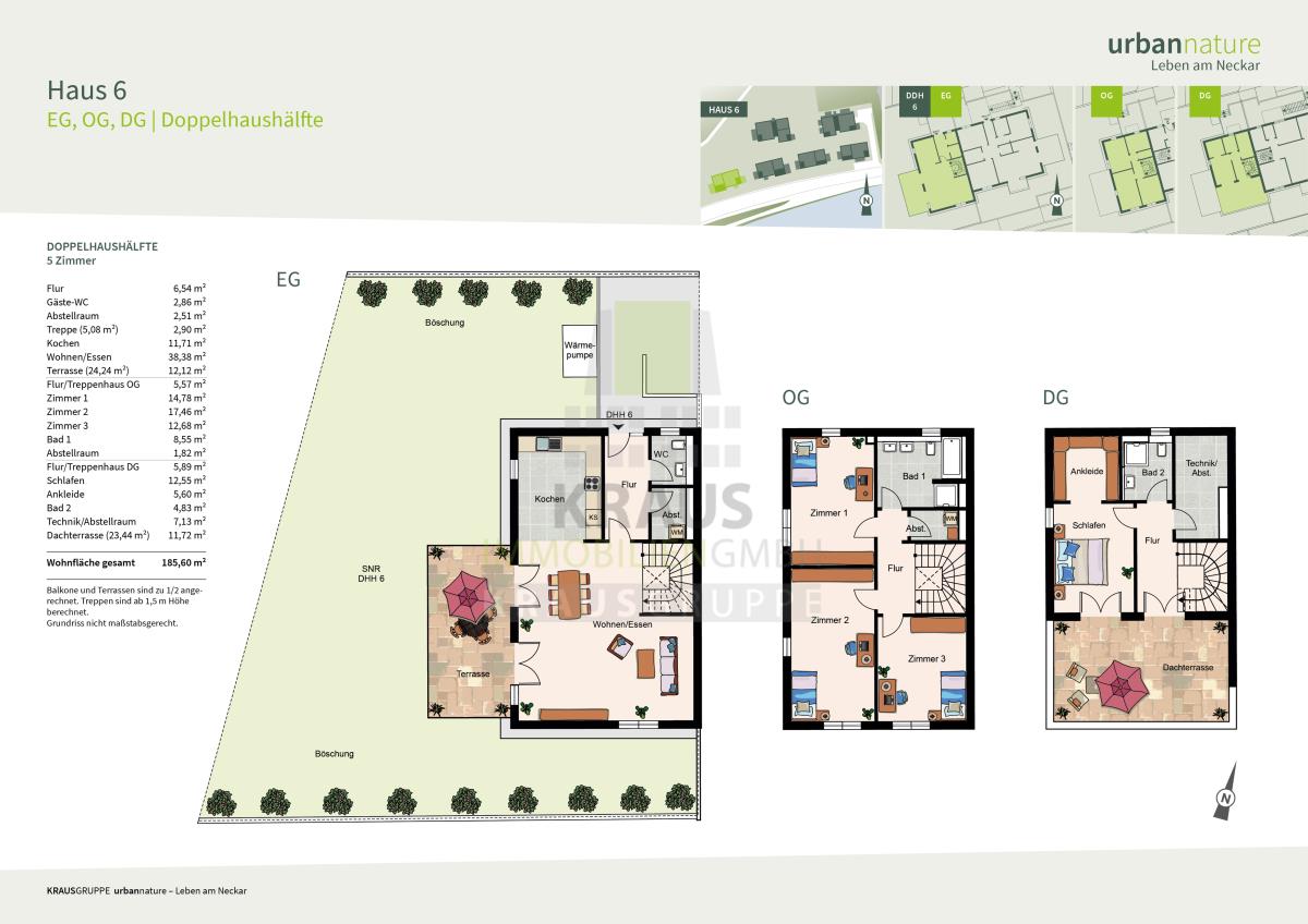 Die zum Verkauf stehende Doppelhaushälfte (Haus 6) verfügt über 5 Zimmer, verteilt auf 3 Ebenen und erstreckt sich über ca. 185,60 m² Wohnfläche. Das Erdgeschoss bietet einen großzügigen Wohn-/ Essbereich mit offener Küche. Von hier hat man Zugang zu der schönen West-Terrasse und einem großen Gartenanteil, der zum Erholen im Grünen einlädt. Ein Gäste-WC sowie ein Abstellraum mit Waschmaschinenanschluss befinden sich ebenfalls in dieser Etage.