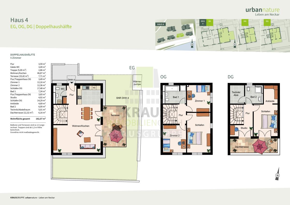 Die zum Verkauf stehende Doppelhaushälfte (Haus 4) verfügt über 5-Zimmer, verteilt auf 3 Ebenen und erstreckt sich über ca. 162,070 m² Wohnfläche. Das Erdgeschoss bietet einen großzügigen Wohn-/ Essbereich mit offener Küche. Von hier hat man Zugang zu der schönen Ost-Terrasse und einem Gartenanteil, der zum Erholen im Grünen einlädt. Ein großes Gäste-WC mit Waschmaschinenanschluss befinden sich ebenfalls in dieser Etage.