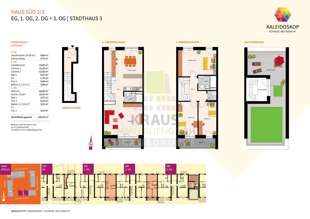 Die Stadthäuser als Haus im Haus – einfach ideal für Familien. Die Häuser S2 und S3 beherbergen vor allem Maisonette-Wohnungen als „gestapelte“ Reihenhäuser mit direktem Gartenzugang – in den oberen Wohnungen mit großzügiger privater Dachterrasse. Ein wunderbares Domizil beispielsweise für Familien. Im Erdgeschoss befindet sich zudem eine kleine kompakte 2-Zimmer-Wohnung, ebenfalls mit Zugang zum Garten. Beide Häuser variieren durch unterschiedlichen Einsatz bodentiefer Fenster, Brüstungen, Balkone und Öffnungen und schaffen so eine lebendige Fassade.